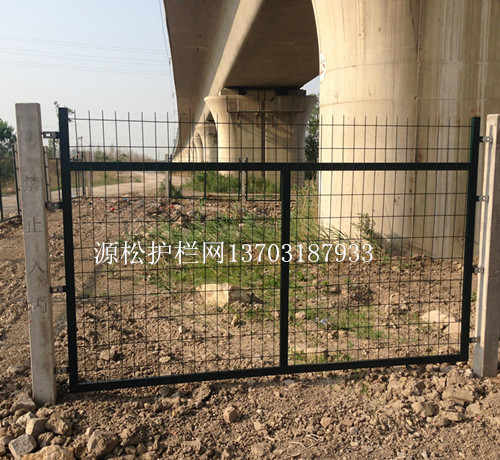 鋼筋混凝土立柱金屬網(wǎng)片防護(hù)柵欄可采用單開(kāi)門(mén)或雙開(kāi)門(mén)兩種形式。單開(kāi)寬度1.5m,雙開(kāi)寬度3m,其網(wǎng)片形式與防護(hù)柵欄保持一致,并通過(guò)銷鈾、銷鈾套與立柱連接。