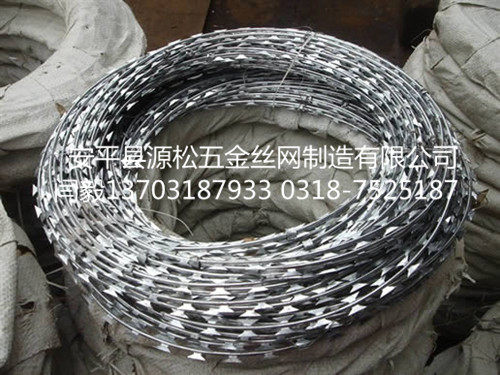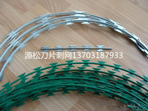 刀片刺網(wǎng)又名刮刀型刺絲,是一種近年發(fā)展起來(lái)的防護(hù)、隔離能力較強(qiáng)的新型防護(hù)網(wǎng)產(chǎn)品。它采用鋼板沖壓成型包附于鋼絲(筋絲)之上,由銳利尖角鍍鋅鋼板或不銹鋼薄板做刀片,高張力鋼絲做芯線組合而成的。鋒利的刀型刺由雙線扣裝后成蛇腹?fàn)?,既美觀又讓人不寒而栗。起到了很好的阻嚇作用。