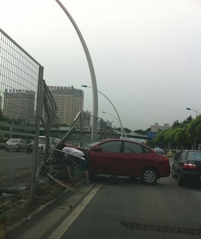 中環(huán)外圈吳中路下匝道處發(fā)生一起單車事故,一輛紅色北京現(xiàn)代轎車突然失控,一頭撞上中環(huán)隔離欄,橫在車道上。警方、施救車隨后趕到現(xiàn)場(chǎng)處置,吳中路出口臨時(shí)封鎖。